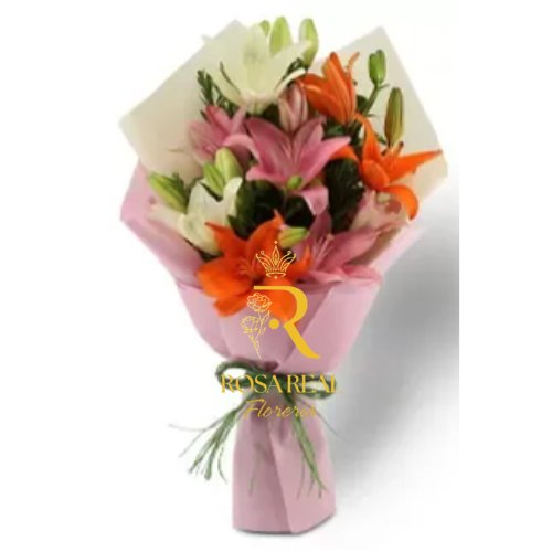 En Rosa Real te presentamos el Ramo de 10 Lilium Surtidos, una combinación perfecta de elegancia, frescura y color para transmitir alegría en cualquier ocasión. Este arreglo floral está compuesto por 10 tallos de lilium frescos en una variedad de tonos vibrantes, cuidadosamente seleccionados para garantizar belleza y durabilidad.