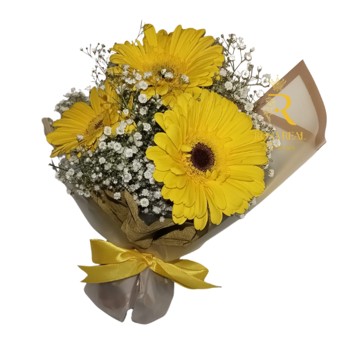 Este ramo está compuesto por 3 gerberas frescas, cuidadosamente seleccionadas por su calidad y color vibrante. Se presenta en un envoltorio decorativo elegante que resalta la belleza natural de cada flor, convirtiéndolo en un obsequio minimalista pero muy significativo.